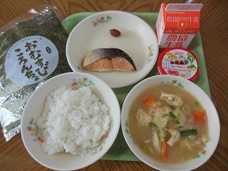 1月24日(火)から30日までの1週間は、全国学校給食週間です。日本の学校給食は明治22年に山形県の鶴岡町(現在の鶴岡市)の私立忠愛小学校で、生活に苦しむ家庭の子どもたちのために昼食を与えたことか始まりとされています。当時の給食の内容は、おにぎりや塩さけ、菜の漬け物などといわれています。今日の給食は、その当時の給食を再現した粗食給食です。戦争で学校給食を中止することになりましたが、昭和21年12月24日、戦後初の学校給食が作られ記念日となりました。冬休みとの関係で、その1ヶ月後の1月24日からが学校給食週間になっています。