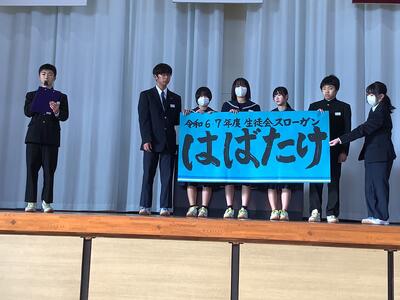 最後に、生徒会本部役員から後期生徒会スローガンが発表されました。それは「はばたけ」です。これまでは4文字熟語だったり英語を使ったりしていましたが、シンプルに広く伝わるよう平仮名でのスローガンとなりました。副会長の稲田さんが筆で書いたスローガンの意味を、会長の石川さんから全校生に伝えました。