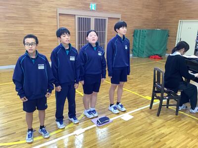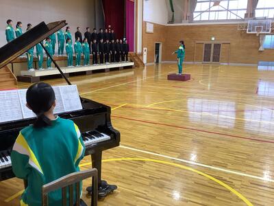 今日のリハーサルは1年生です。1年生にとって初めての合唱コンクール。小学校のころより人数も増え、約30名の合唱というのは初めての経験だと思います。リハーサルでは何度も動きの確認をして、合唱隊形をスムーズに作れるようにしました。歌声については、そろそろ高音が出にくい変声期に入る生徒もいますが、皆、精一杯に表現しようとしています。互いのクラス合唱を聞いて、本番に向けてさらに気持ちが引き締まったようです。