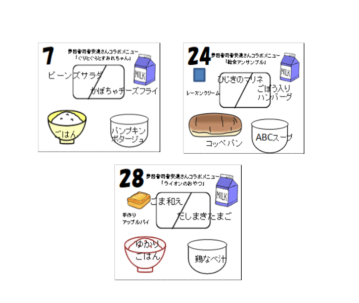 今月の給食では、「食欲の秋」と「読書の秋」を掛け合わせ、夢図書司書の安達さんとのコラボメニューが3回提供されることになってます。1回目は7日(月)に提供されましたが、生徒たちは気付いていたでしょうか?絵本でおなじみの「ぐりとぐら」シリーズから「パンプキンポタージュ」が選ばれました。食を通して、話の内容がどのようなものなのか、本にも興味をもってもらえればと思います。さて、2回目は24日(木)、3回目は28日(月)となります。メニューのもとになった本を読んでから食べてみると、味わいが変わるかも知れませんね。(意外と本の中に料理が登場することが多いので、新たな視点で読書するのも面白いです!)