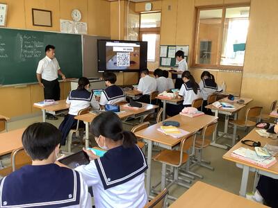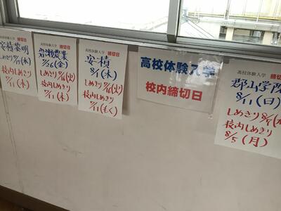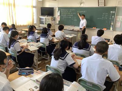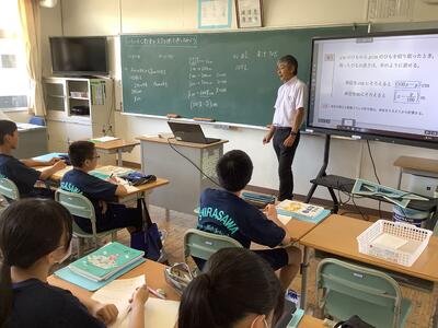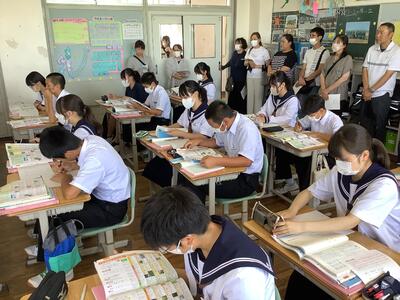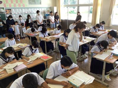 本日は、厳しい暑さの中、たくさんの保護者の皆さまのご来校に感謝申し上げます。普段通りの授業を見ていただきましたが、保護者の方に囲まれたせいか、生徒はやや緊張していたようです。いつもなら、もっと活発に発言したり周囲と意見を交わしたりして、はつらつとした姿を見ることができます。(真剣に取り組む姿は、いつも通りでした。)