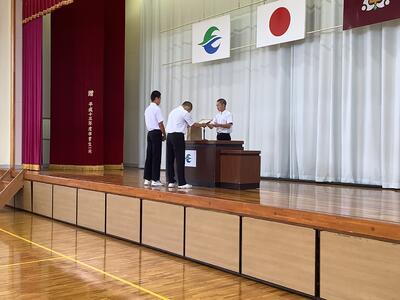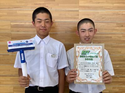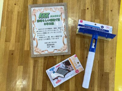 次に、環境委員会です。先日の「KKKコンテスト」の結果発表と表彰でした。どのクラスも掲示が工夫され、教室も隅々まできれいにされていました。(生徒の一生懸命さに感激します!)その結果、どのクラスも高得点でしたが、1位となったのは3年2組でした。(おめでとうございます!)あと2回の「KKKコンテスト」では、果たしてどのクラスが1位になるか楽しみです。なお、1位のクラスには、賞品として「清掃便利グッズ」も贈呈されました。