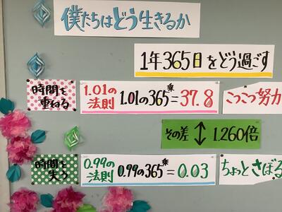 上の写真は、3年生のフロアにある掲示物です。日々のわずかな学習の取り組みの差が、積み重ねれば大きな違いとなり、確かな力へとつながります!受験生だけでなく、1,2年生にも気付いてほしい!
