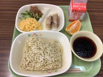 毎回、給食のメニューには驚かされますが、本日は「冷やし中華」です。お店や家庭では夏の定番かも知れませんが、給食の献立となると簡単ではありません。栄養士さんの創意工夫と、調理員さんの手間を惜しまない労力があってこそ実現できるメニューです。(これだけの献立を毎日ワンコイン以下で食べられるなんて、本当に感謝しかありません。)
