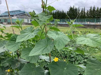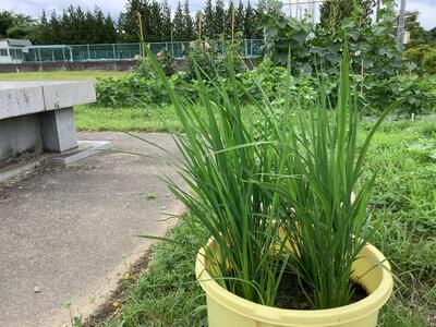ようやく梅雨の時季らしい雨も降ったことで、順調に成長し、キュウリなどたくさんの夏野菜が実り、収穫もできています。また、稲のようすも青々としたまっすぐな葉が伸び、元気に育っています。まもなく1学期も終わりますが、畑の野菜は、まだまだ育ち続けます。