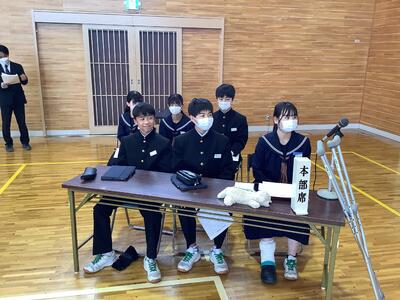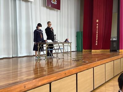 <生徒会総会の終わりに、全校生に柱時計の復活を伝えました。>