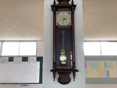平成2年度卒業記念品として贈呈された柱時計。長年にわたって昇降口に設置されていましたが、いつの間にか動かなくなっていました。平成2年は、西暦だと1990年ですから、およそ30年もの間、登校する生徒を見守ってきましたが、動かない時計では誰も見向きもしなくなってしまいました。一部の生徒からは、「時計は直らないのですか?」という声もありましたが、30年前では部品もないかもと、半ば諦めつつ、思い切って修理に出したところ、再び動き出しました。これからは、多くの生徒が柱時計で時間の確認をすることになるでしょう。