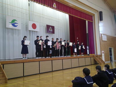 本日の全校集会で、4月からの各種大会で活躍し、見事入賞した特設陸上部、野球部、バレーボール部の表彰披露をしました。これからも多くの大会が行われます。この勢いに乗って、他の部も活躍していくことでしょう。がんばれ白中生!(※表彰の記録は以下の通りです。)