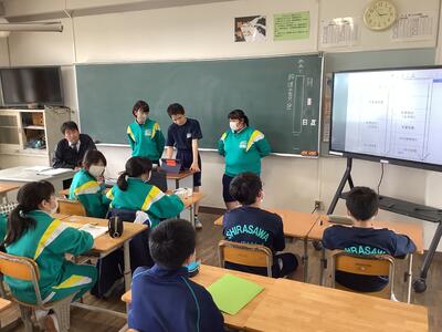 本校では、各学年で必読書を指定し、質のよい読書を共通で行っています。今日は、しらさわ夢図書館司書(学校司書)の安達さんによるブックトークが1年生で行われました。「生き方~友だちとのつながり」をテーマに、必読書である「君たちはどう生きるか」をふくめた4冊の本を紹介していただきました。その後、1年生は国語の授業で、図書室の利用の仕方を確認し、実際に必読書を借りました。