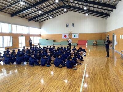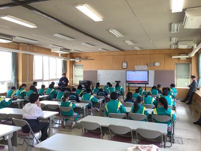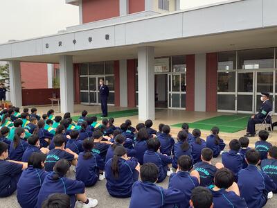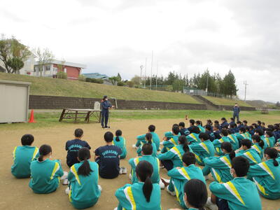 冬期間に通学バスを利用していた生徒も、自転車通学を再開し、自転車小屋にはたくさんの自転車が並ぶようになりました。本日の交通安全教室では、登下校の安全を守るため、ヘルメットの必要性や事故の起きやすい状況などを警察の方からお話をいただきました。その後、実際に通学路の自転車走行の様子を教員で確認しながら生徒に指導しました。通学だけでなく,普段から交通ルールやマナーについて意識してほしいと思います。