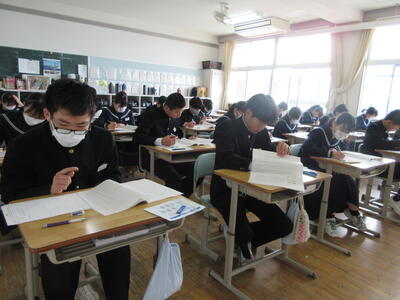 4月18日(木)に、全国学力学習状況調査を実施しました。この調査は全国の中学3年生を対象としたものです。今年度は、国語と数学の学力や学習状況を把握・分析し、今後の学習指導の充実に役立てます。今年度最初の試験となりましたが、みんな真剣な態度で試験に臨んでいました。