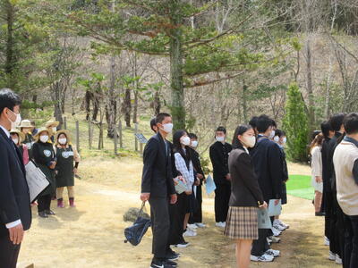 本日、晴天の中、離任式を実施しました。今年度は、4人の教師が本校から離任することになりました。連絡を受け、卒業生までたくさん集まってくれました。
