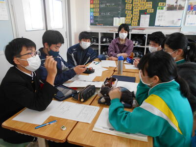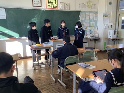 3年生は授業参観でグループごとに発表する動画について、内容を検討したり、発表原稿や役割分担などを話し合っていました。テーマはグループごとに違っています。どんな動画になるのか楽しみです。