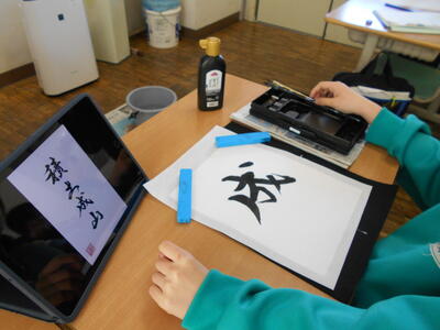 2年生は自分の決意を1文字で表現するための漢字選びを行いました。一人一人自分の思いを文字に託そうと真剣にタブレットを使いながら選んでいました。また、選び終わった生徒たちは文字を書く練習を行いました。文字を選び終わった生徒たちの話す言葉や表情には自信が感じられ、とても頼もしく思えました。