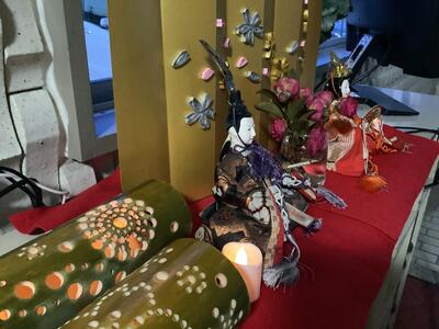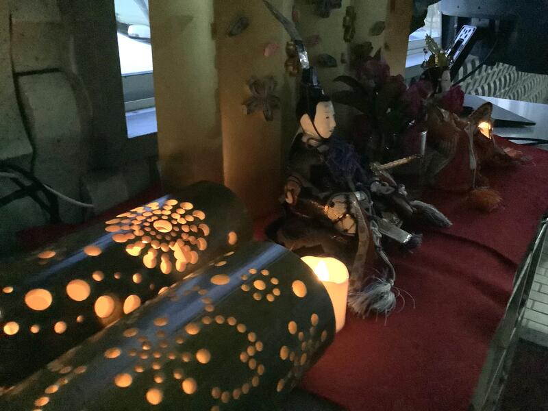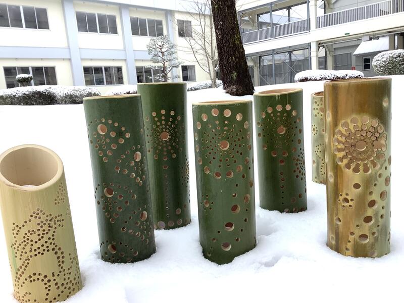 職員玄関には「竹灯籠」と「ひな人形」を飾っていただきました。「竹灯籠」は遠藤先生が、「ひな人形」は守谷さんが用意してくれました。(竹灯籠は遠藤先生の自作です)