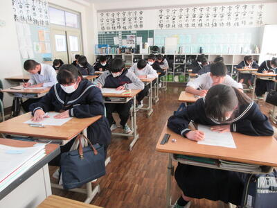 本日は定期テストの1日目でした。数学、技・家、保体、国語の4教科のテストを行いました。感染症の影響で部活動中止の日が続き、これまでよりじっくり学習に取り組めた生徒が多かったようです。明日は英語、理科、音楽、社会のテストを行います。下校するときに、「明日のテストもがんばります。さようなら。」と元気にあいさつしてくれた生徒もいました。残りの教科の勉強もがんばってほしいと思います。