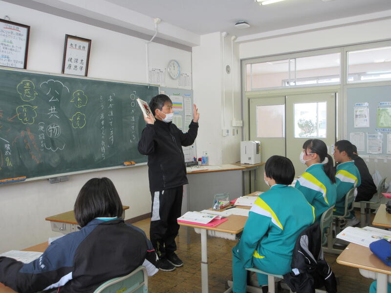 さて、今日の1年生の道徳は、学年主任と教務主任が担当しました。できるだけローテーションを組み、道徳の授業を行っています。1組は「郷土」について、2組は「公共」についての授業でした。生徒の自然な発想を引き出し、揺さぶりをかけながら、自分自身の考えと他者の考えを共有し合う授業です。いろいろな意見が出るのが1年生の強みです。真剣に文章を読んで自分自身の考えをまとめる姿は非常にすばらしかったです。
