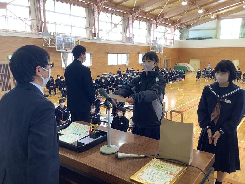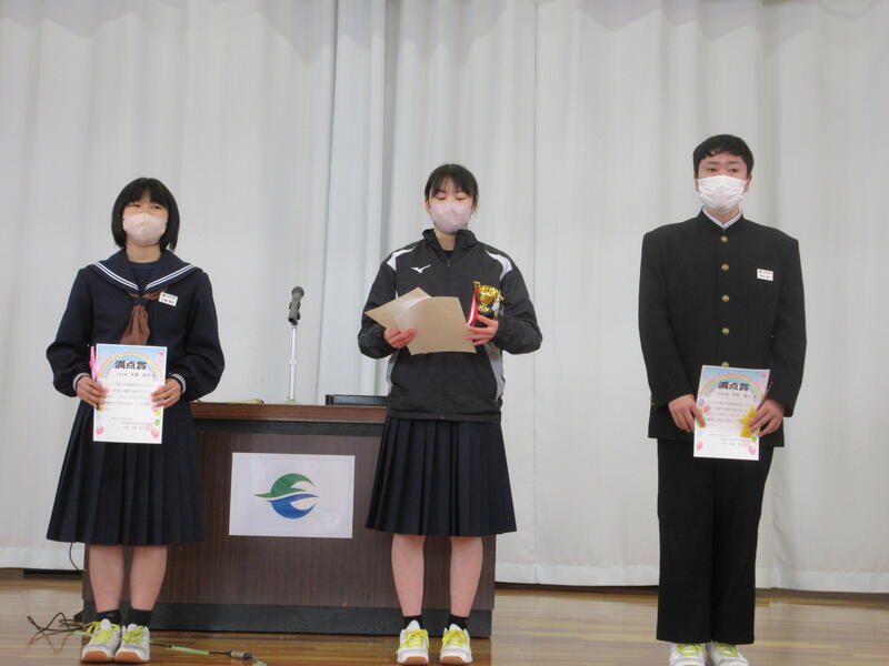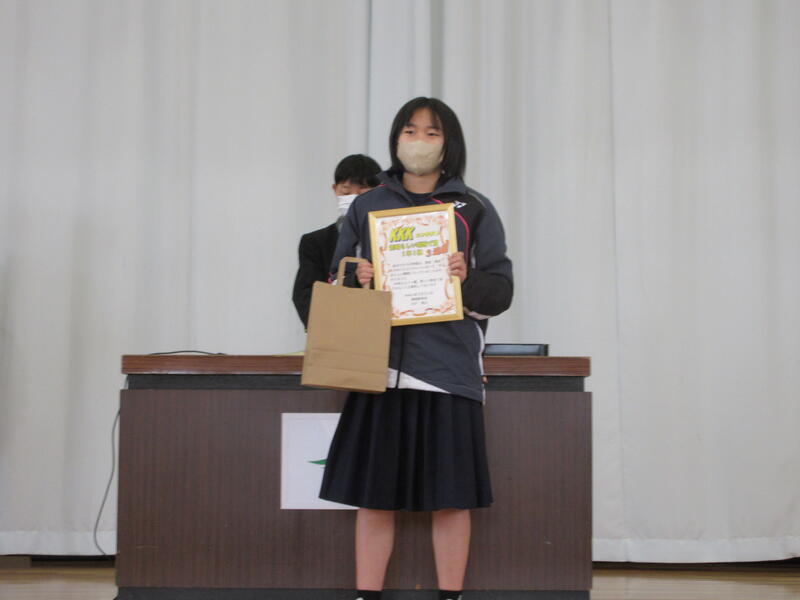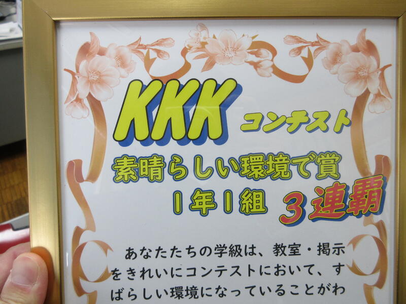 また、環境委員会主催のKKKコンテストの表彰も行い、今回も「すばらしい環境で賞」は、1年1組でした。おめでとうございます。ちなみに1年1組は3連覇です。環境委員長の宍戸さんから、賞状と景品が手渡されました。
