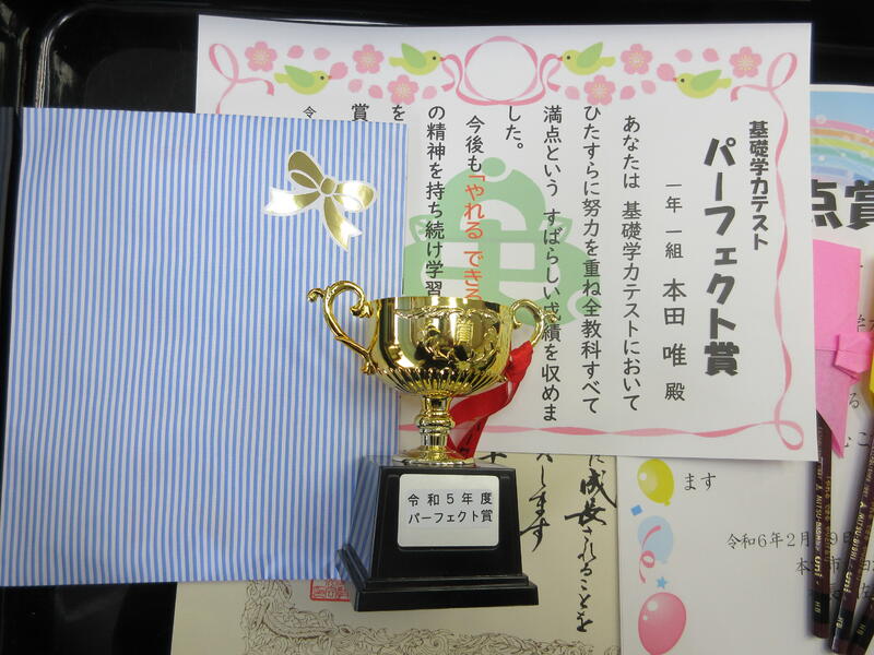 表彰伝達も行いました。今日は第4回基礎学力テスト満点賞の表彰と、4回全てで満点賞をとった「パーフェクト賞」の表彰です。パーフェクト賞は、1年生の本田さんで全学年で1名のみでした。これってすごいことです、見事です。