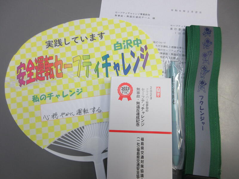 実は職員も頑張ってます。この半年間、福島県交通安全協会で主催している「セーフティ・チャレンジ事業」に参加していました。無事全職員、無事故・無違反達成です。達成記念品を全員にいただきました。今後も、職員一同、安全運転を心がけていきます。