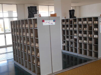 下駄箱の様子です。下足がきちんと下駄箱に並んでいます。全員が登校した後、担任以外の先生が下足を揃えてくれています。下校時には気持ちよく帰れそうです。