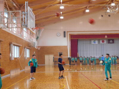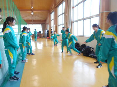 体育館ではバドミントン部とバスケ部がフロアーで練習を行っていました。バレー部はギャラリーの狭いスペースを利用して敏捷性や瞬発力を鍛える演習を行っていました。