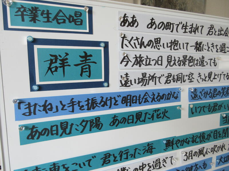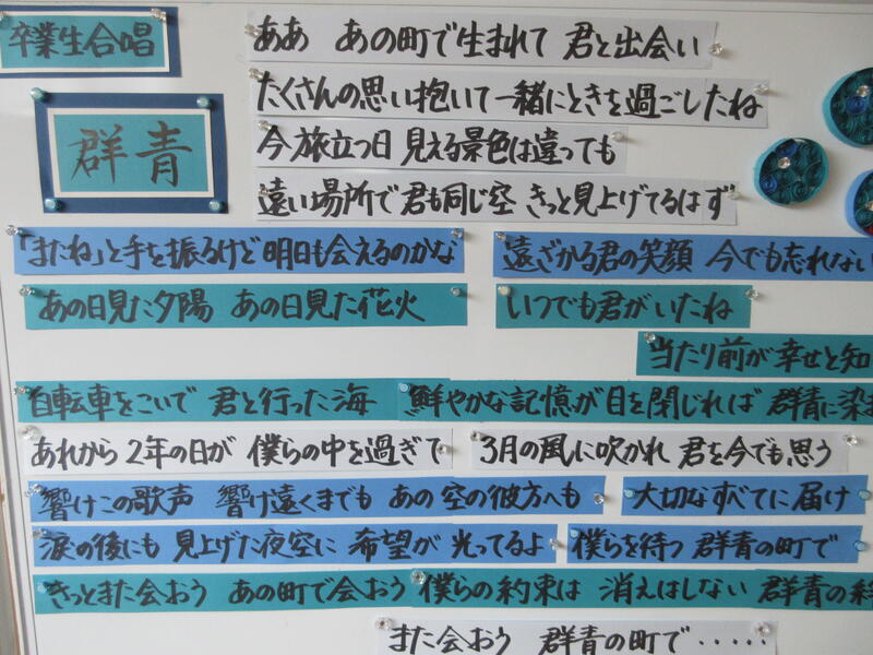 そして再来週は、なんと卒業式です。驚きます。ほんとうに時間というのは待ってはくれませんね。義務教育が一区切りするとは、自分の意志で進んでいくとは、など伝えたいことはたくさんあります。時間は待ってはくれませんので、伝えることはしっかりと話していきたいと思います。そして心が整った状態で当日を迎え、よい卒業式にしていきたいですね。昇降口の掲示版に、3年生が卒業式で歌う「群青」の歌詞を守谷さんが心を込めて書いてくれました。歌詞の意味に思いを寄せながら最後の学校生活を充実させてほしいと心から願っています。