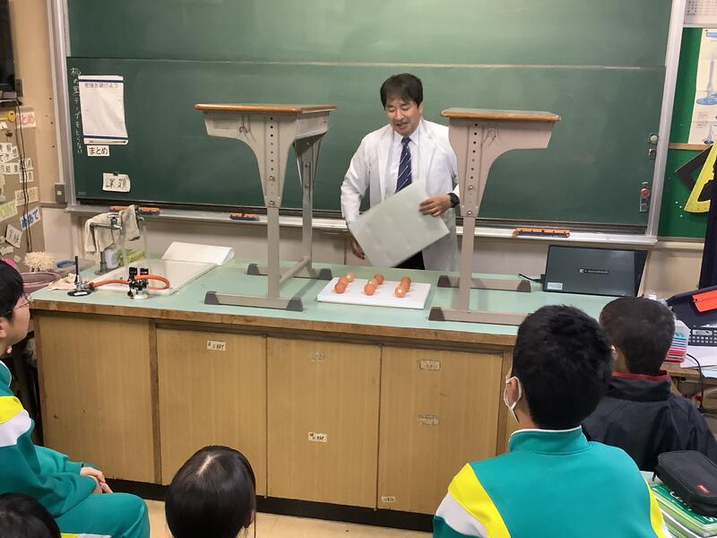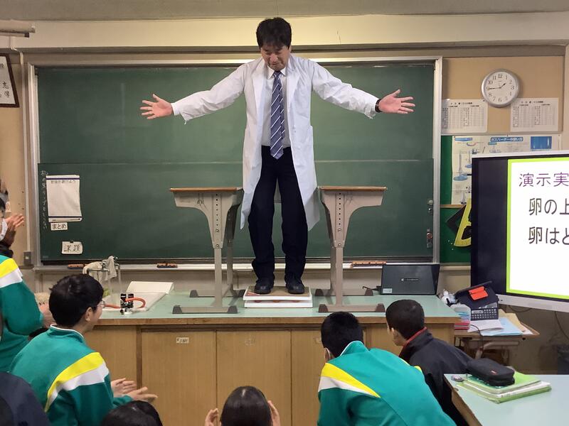 今日も理科の実験の授業です。圧力の学習を卵を使っての実験です。実験の楽しさは、やはり予想を裏切る結果がでたときではないでしょうか。森藤先生が卵の上に乗ったら卵が割れると思った生徒は多かったはず。結果は割れませんでした。生徒達は、紙コップの上に乗って実験です。実験を通して、圧力の分散を学習することができました。