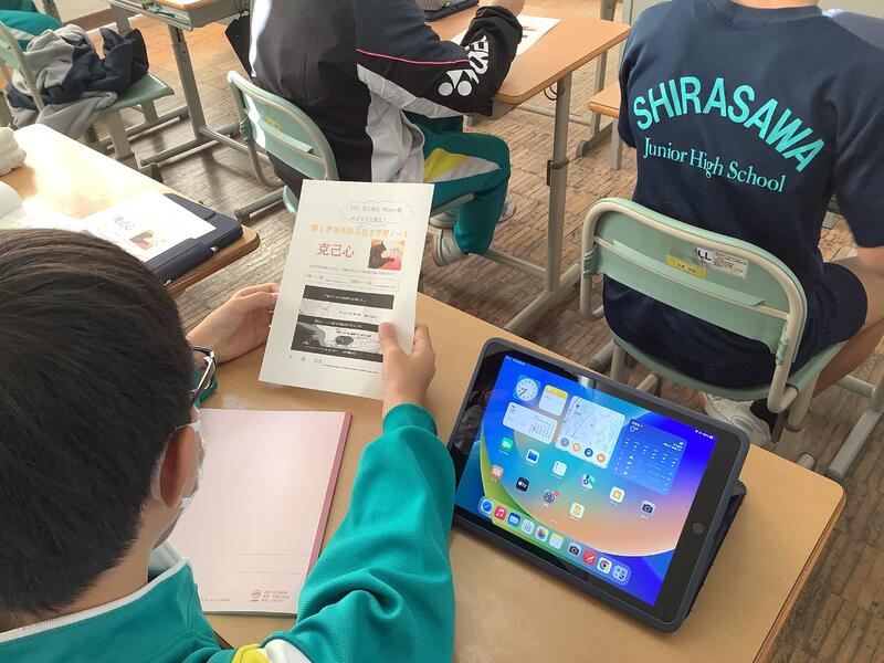 学級活動では、各学年、自分と向き合う時間になったようです。全学年共通で、「学校アンケート」、今年の「白沢中学校、漢字一文字アンケート」を行いました。学校アンケートは、1学期と同じ質問を行い、2つの集計と比較をして、来年度の教育に生かすために行っています。漢字一文字アンケートは、新生徒会役員が発案しました。集計して決まった漢字を2学期終業式で発表します。初めての生徒会企画です。どんな漢字になるのか、どのように発表するのか楽しみです。