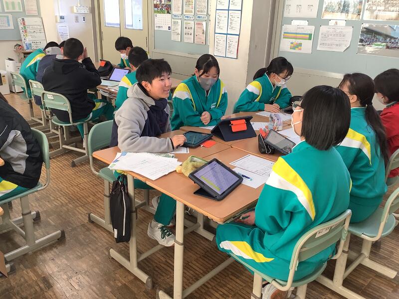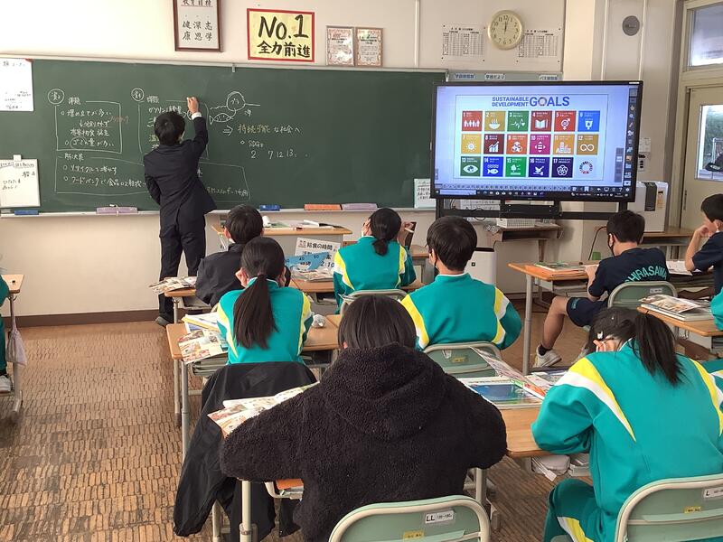 1年生の社会では、SDGsに関連させて、環境について学習していました。海のブラスチックを魚が食べて、その魚を人間が食べたらどのようなことが起こるかなどわかりやすく説明し、議論を活発化させていました。人間が便利さと引き替えに人間を苦しめているという結果を踏まえ、社会問題を考えていました。