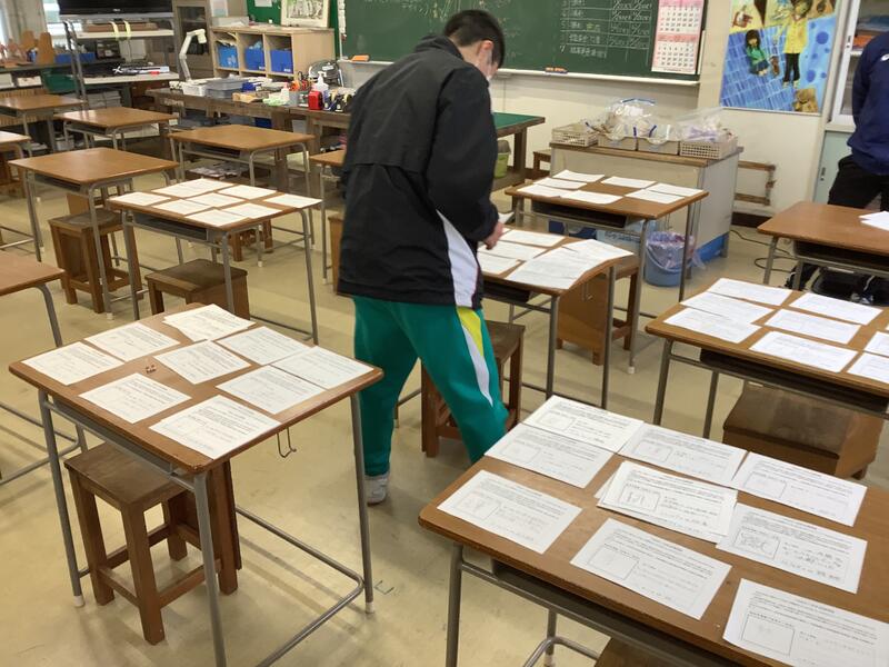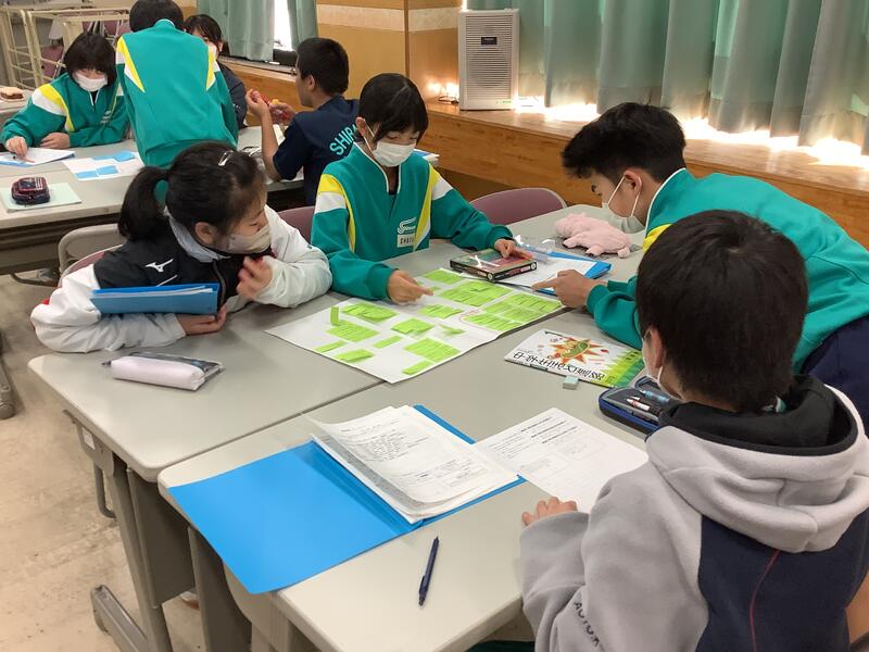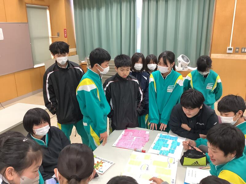 1年生では、職場調べを継続しています。各班で、100以上の仕事を出して分類作業を行っていました。「人に関わる」「動物に関わる」「ものに関わる」に分類したり、必要な知識や技能(国数英理社音美体技家)の分類も行いました。一人ひとり、いろいろと調べ一生懸命に分類作業を行いました。班ごとに発表をして交流する中で、生徒たちは、最終的に人に関わってくること、そして職業に関する偏見(視野の狭さ)感じることができたようです。今後も更にさまざまな視点で考えさせるキャリア教育にしていきたいと思います。