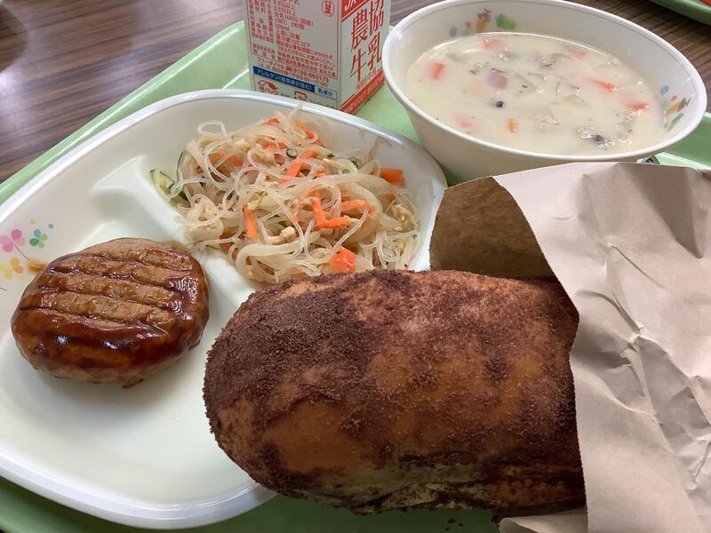 給食は、揚げパンでした。作業の関係上、最近の給食ではほとんどといっていいほどメニューから無くなっています。昔はよく出ていたメニューで、懐かしさを感じる保護者の方もたくさんいると思います。どの学級の生徒たちも、とても美味しい叫んでいました。揚げパン、チーズインハンバーグ、アサリたっぷりクラムチャウダー、春雨と今日も豪華な給食でした。家庭科の授業とタイアップしてメニューを考え、実現できるように栄養士の深谷さんが計算して実現しています。自校給食でしかできない生きた教育(食育)がここにはあります。