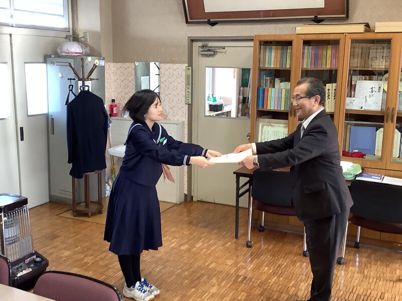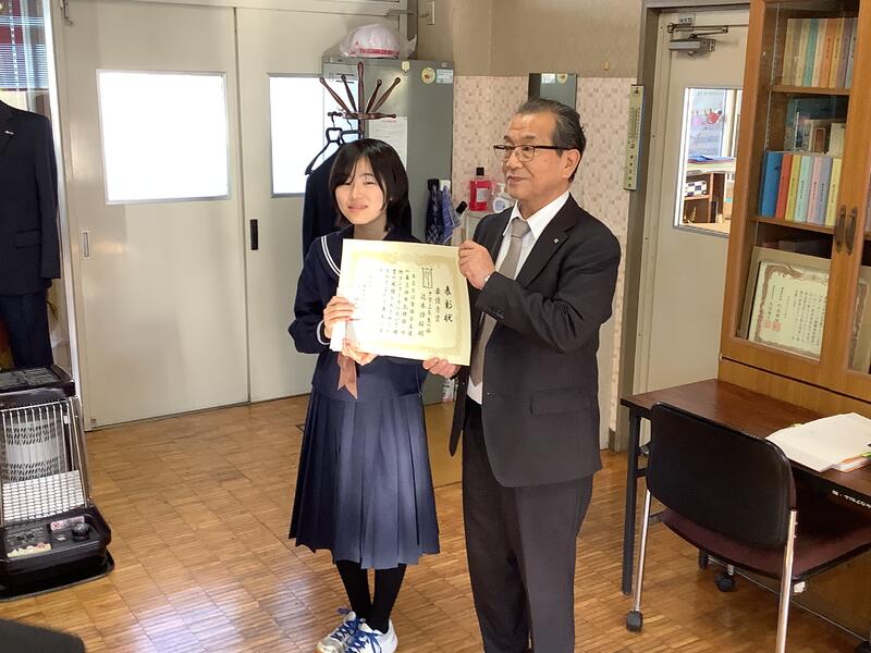午後、校長室にて牛乳標語コンクールの表彰式がありました。なんと最優秀賞に本校3年生の辻本さんが選ばれました。緊張した面持ちで新聞社の取材も受けていました。そして何と、辻本さんの作品が2月中旬から下旬にかけて、酪王協同乳業から出荷される1Lの牛乳パック1万本のパッケージに載る予定です。期待して待っていてください。本当におめでとうございます。