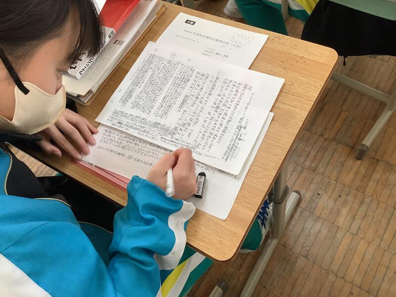 3年生の教室では、高校の志願理由や面接対策、そして模擬テスト対策を黙々と行っていました。考えていることを表現する活動をたくさんしてきたものの、相手に自分の良さを伝えるとなるとなかなか上手に表現できないものです。勉強も含め、特に3年生は自分自身と向き合う時間が非常に多いです。答えを安易に提供するのではなく、しっかりと悩ませる。これが成長には欠かせない、非常に重要な時間なんです。