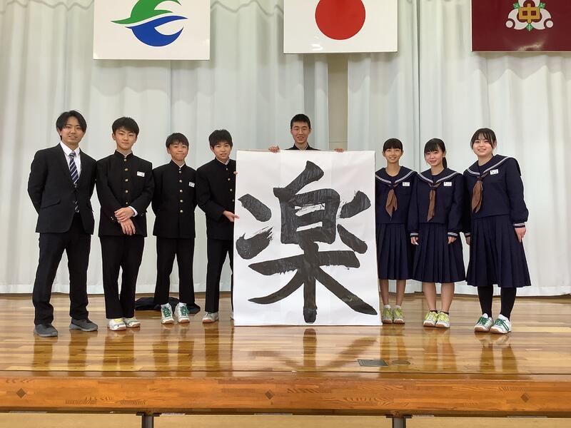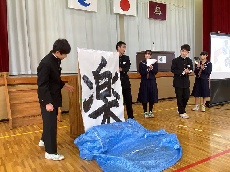 今年の漢字一文字、1位は「楽」でした。会長からは、楽しむという意味を、「充実するから楽しい」、「一生懸命だから楽しめる」、そして白中祭の「音楽」が最高だったことにも触れ、来年にもつなげてほしいという気持ちを話していました。ちなみに2位は「笑」、3位は「努」です。本部全員で全校生を巻き込むパフォーマンスもあり、良い発表でした。