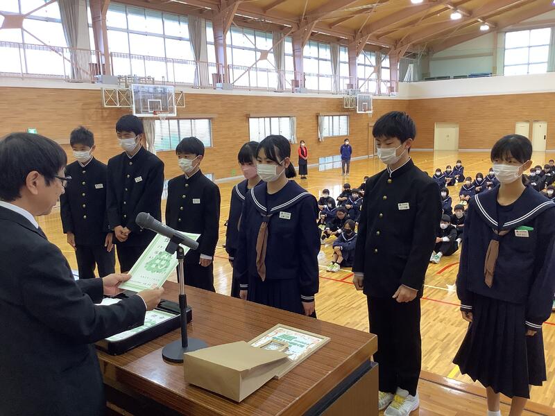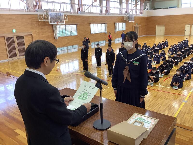 本日、全校集会で後期の学級役員、専門委員会の任命を行いました。一人一人名前を呼び、全校生の前で任命を行い、校長から任命状を受け取りました。校長からは、「任命された人が頑張れるかは、全校生一人一人にかかっています。任命を受けた生徒の責任は大きいが、選んだ人も責任が伴います。みんなで協力して活動できる集団になってほしい」という言葉を受けていました。勇気をもって、成長する自分に期待をして立候補した生徒、まわりからの後押しがあって推薦されて任された生徒もいると思います。委員長ばかりが活躍する学級、委員会は活性化しません。まわりがしっかりと活動して、よい意見が飛び交って活動していのが活性化です。2年生がいよいよ中心です。これからどんな姿を見せてくれるのか楽しみです。