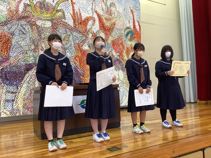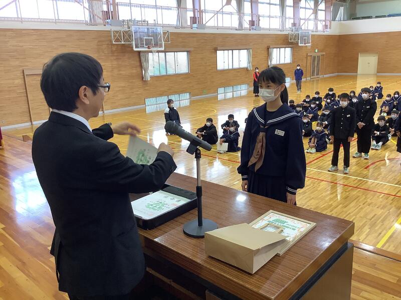 表彰披露では、安達地区と福島県の「読書感想文コンクール」で特選を受賞した生徒を行いました。スポーツ面のみならず、文化面でも活躍している生徒も多くいます。大変すばらしいです。