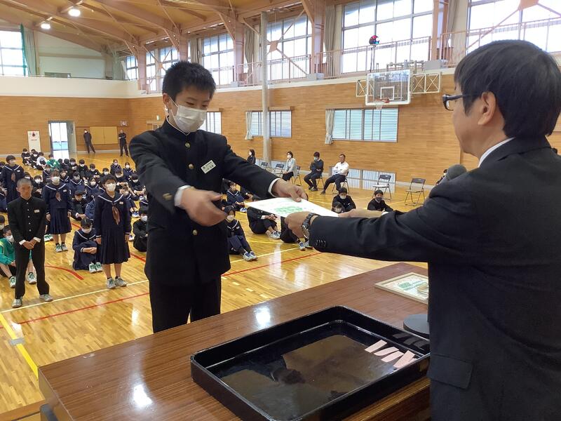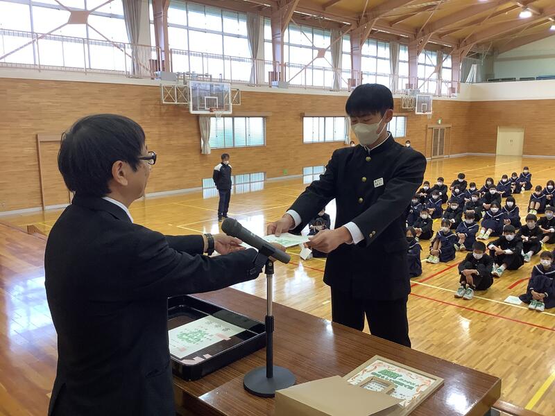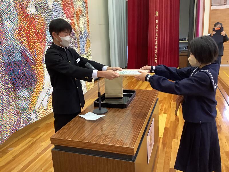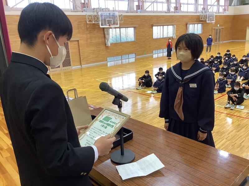 環境委員会「KKKコンテスト」の表彰を行いました。1年1組が「すばらしい環境で賞」に選ばれました。環境委員会が厳正に審査し、環境委員長の渡邊さんから表彰状と景品を渡しました。その後、委員長から、講評が発表されました。生活環境を整えることは、とても必要なことです。これからも定期的に環境整備をしてほしいです。
