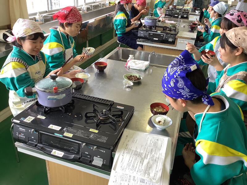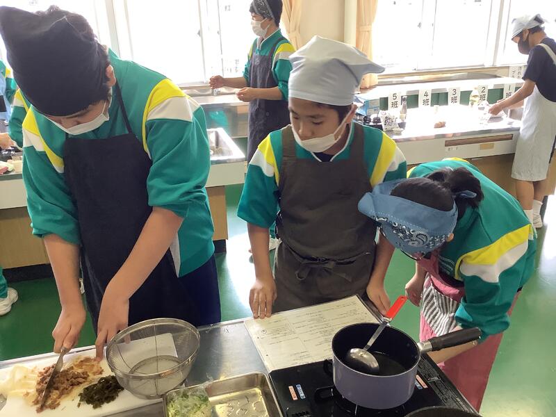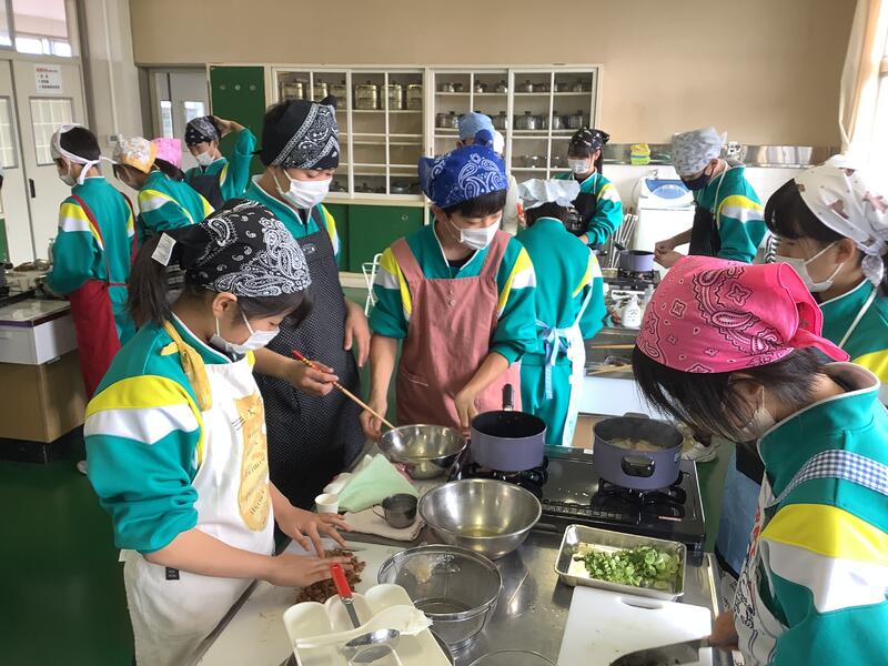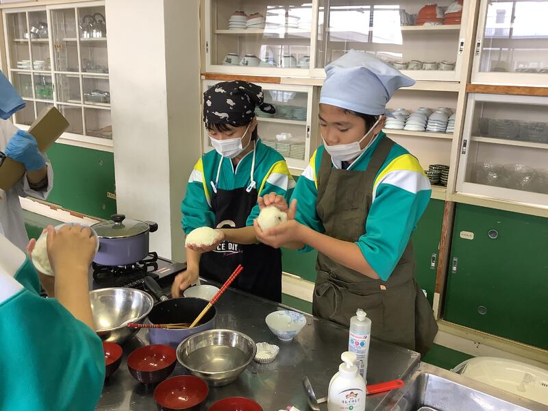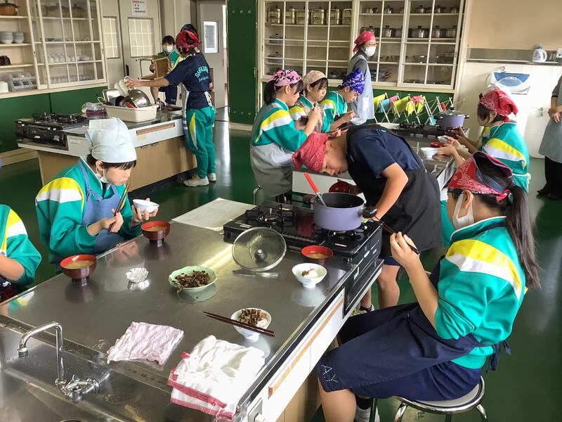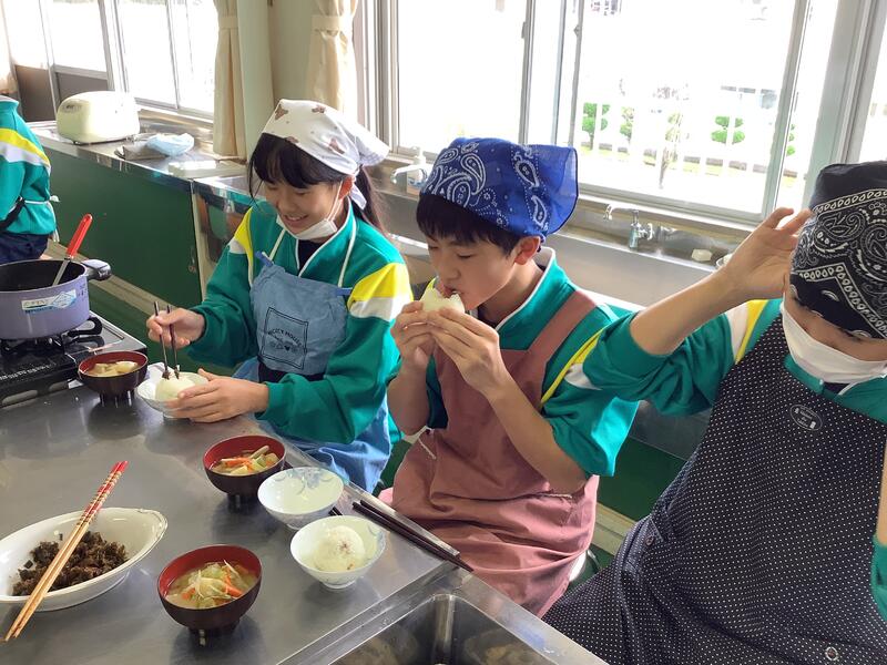 1年1組では、調理実習があり、具だくさん味噌汁、ふりかけ、おにぎりを作りました。班の代表者が朝、登校した順に調理室に向かって、お米をといで炊飯器をセッティングしていました。実習中の様子を見ていると、手際よく準備をする生徒、手間取っている生徒といましたが、全体的によくできていたと思います。どの班も上手に調理をすることができ、みんなで美味しく食べていて良かったです。3・4時限目に実習だったので、その後の給食は食べることができるのか心配しましたが、さすが中学生、給食はしっかりと食べていました。