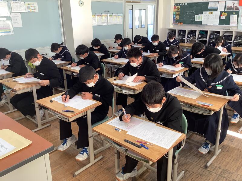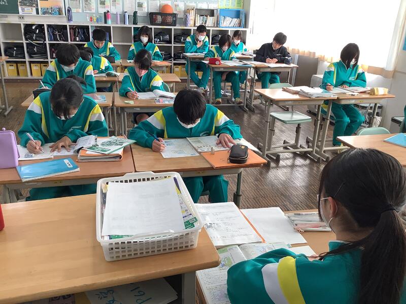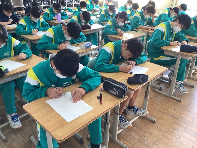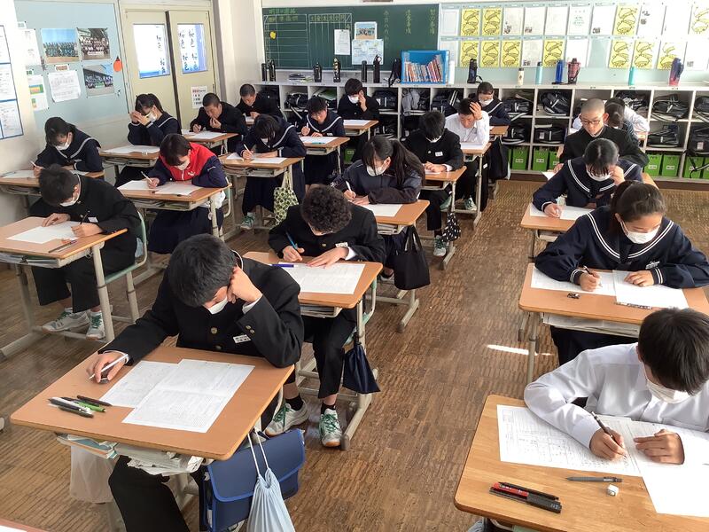 朝は、基礎学力テスト数学からスタートです。10分間基礎問題に一生懸命に取り組んでいました。教室に入って撮影しても、集中力が途切れませんでした。すばらしいですね。来週の定期テストに向けての良いきっかけになったと思います。