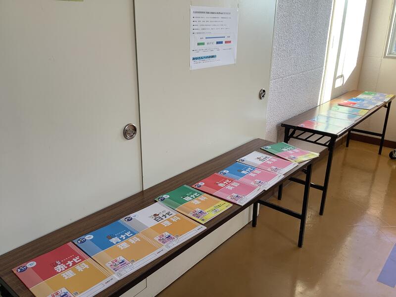 2学年廊下には、来年にかけて利用する受験教材をいつでも見れるようにしています。各教科、難易度の違う4種類のワークブックを購入して、活用していくものです。来月には購入して、すすめていくようです。前向きに学習に取り組んでほしいですね。