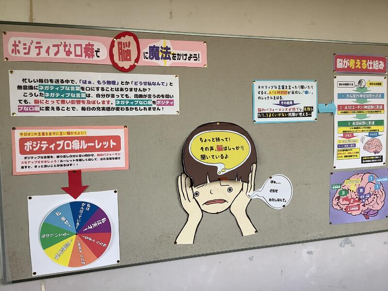 そして、保健室前の掲示がリニューアル。今回も矢吹養護教諭、作です。今回のテーマは「口癖」です。「ポジティブな(前向きな)口癖で、脳に魔法をかけよう」ということで、脳が考える仕組みについて、わかりやすく掲示してありました。