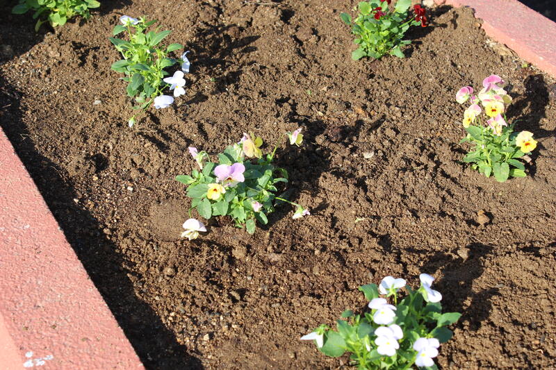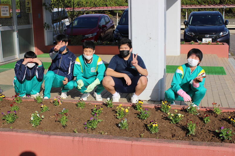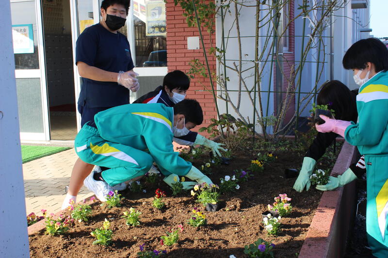 今日は、本宮市から届いたビオラを生徒昇降口、職員玄関、体育館前に植えました。きれいに咲いているビオラを見ることができるように、花壇に等間隔に印を付けて、愛情を込めて生徒と一緒に植えました。これから冬に向かっていきますが、ビオラは寒さに強いので、負けずに玄関先に彩りを与えてくれると思います。これから、環境委員会が中心になって水やりをきちんとしていきたいと思います。