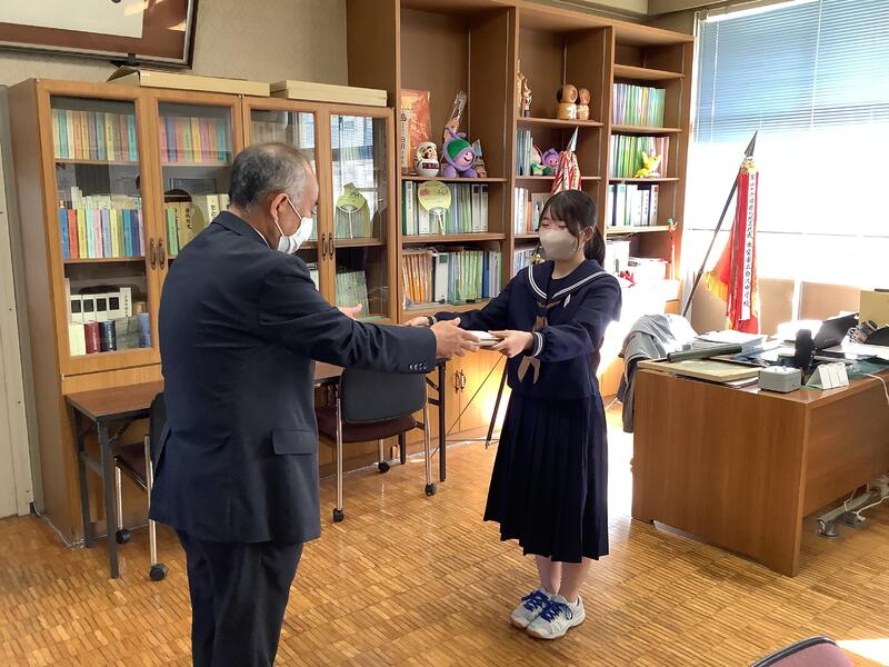 3年生の林さんが、税についての作文で【二本松税務署長賞】を受賞し、本日、二本松税務署長様が来校し、校長室で授与式を行いました。会話の中で、林さんは「たくさん調べて、自分の考えを書くことができた」と話していました。すばらしいですね。