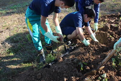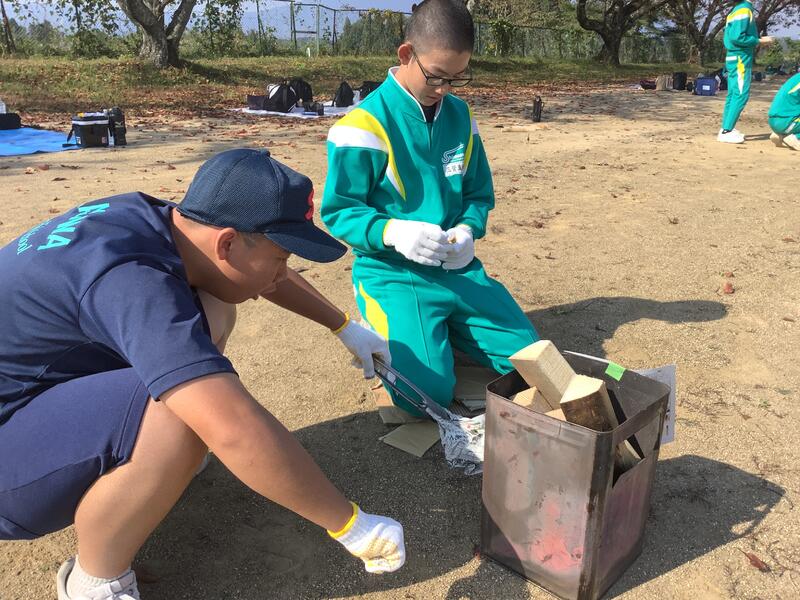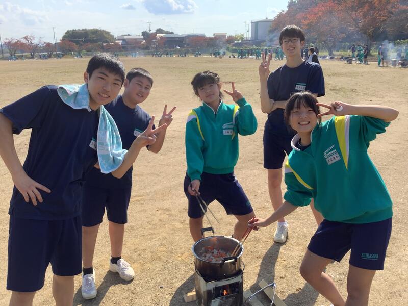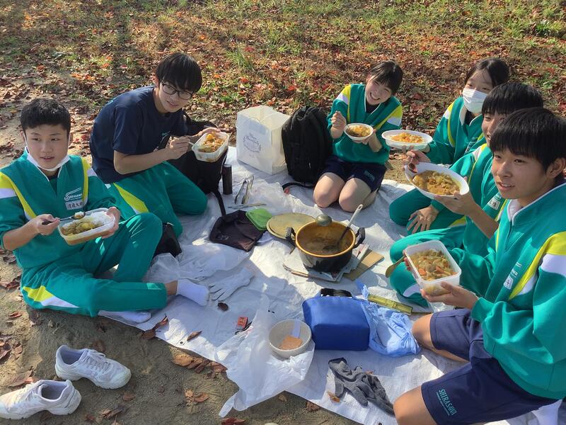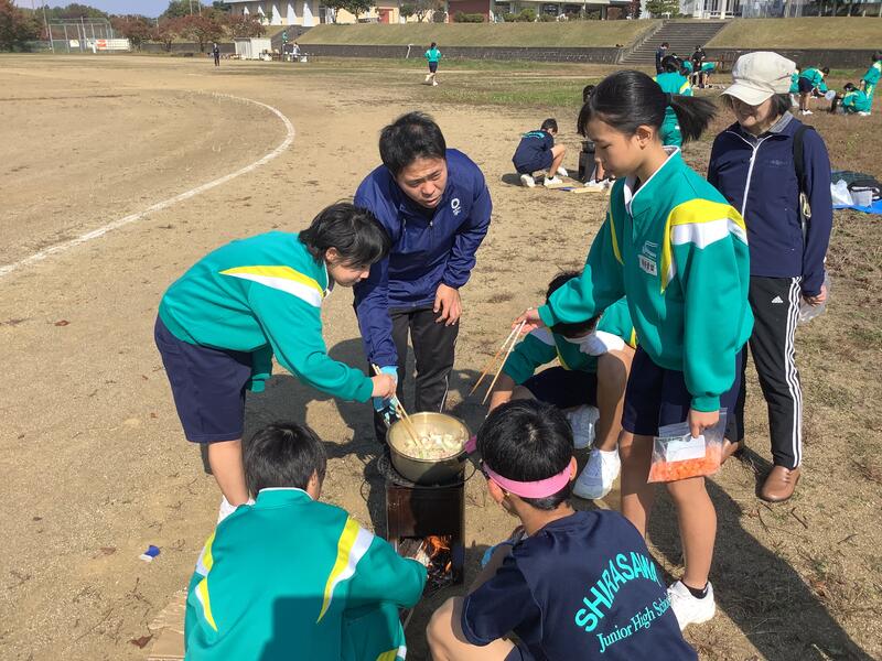 午後の野外炊飯もすばらしかったです。班で協力して準備、盛り付け、片付けを行っていました。準備の様子を見ていると、火や薪を上手に扱える生徒、敏感に火を怖がる生徒、野菜の入れる順番や炒め方にこだわる生徒など、普段見ることのできない姿を発見することができました。やはり、経験している2,3年生は火おこしなど、手際が良かったです。つくづく思うのは、経験させることで、生徒は成長するということです。課題をクリアする時間を与えて、見守る(今回は、薪に火をつけること。食材を調理すること)がとても重要ですね。