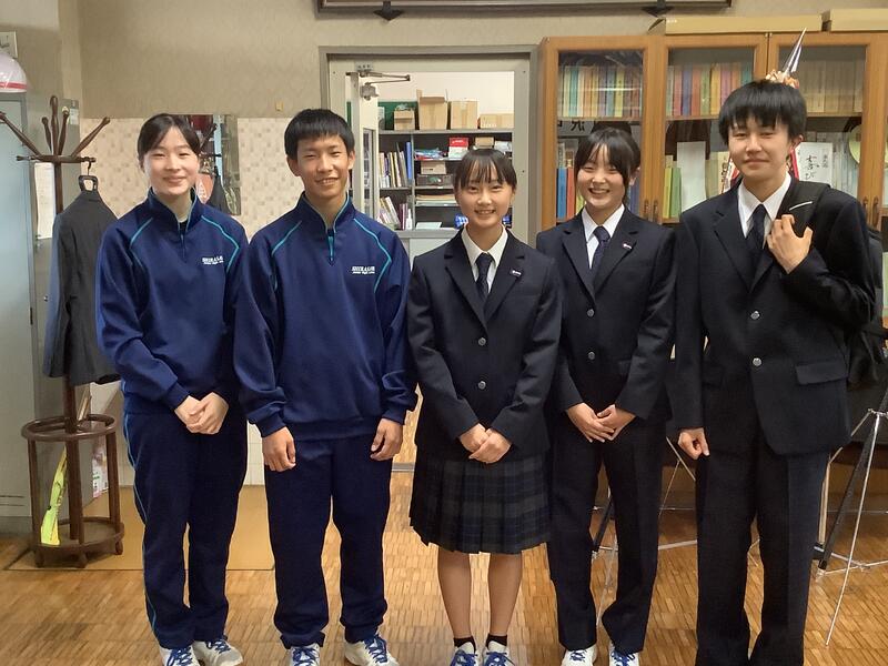 新しい運動着と制服、カバンの発表会です。校長室にて記念写真撮影。