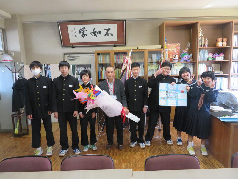 4組ファームで大変お世話になっている根本さんに来校していただき、気持ちの品を贈らせていただきました。