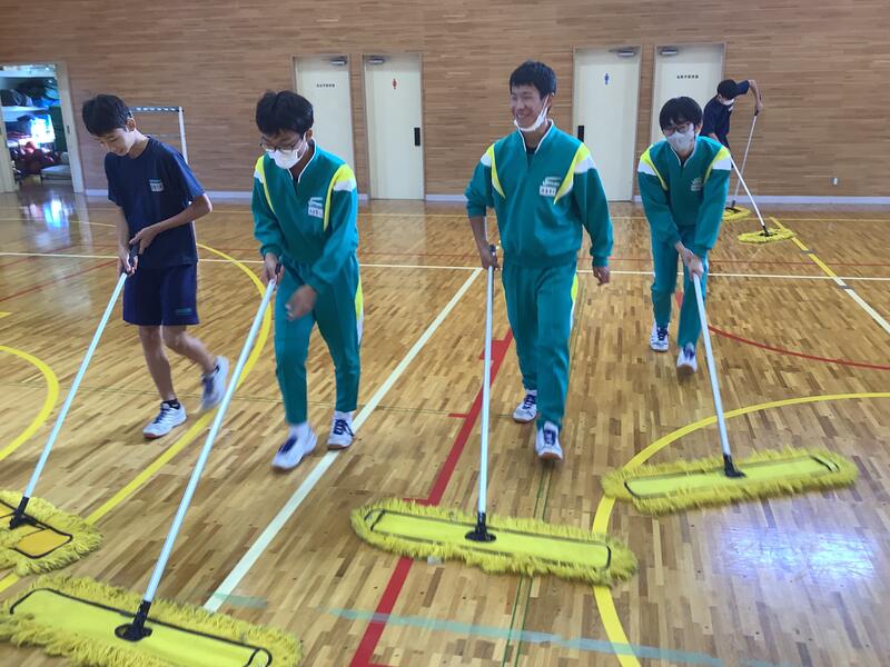 今日は、朝からそわそわしている雰囲気。それは、放課後にKKKコンテストがあり、明日に体育大会を控えているからだろうと感じていました。給食中、環境委員長から整理整頓のチェックポイントを放送で聞き、素早く反応したのが1年生でした。昼休みに校舎を回ると、ドアを外してレールの水拭きをしている生徒や窓ふきをしている生徒がいました。しかも楽しそうにやっています。競わせているつもりはありませんが、気持ちのよい環境をつくろうという行動はすばらしいと感じました。きれいな空間で活動をしたいという思いはみんなもっているはずですのでよい取り組みだと思います。