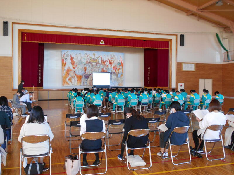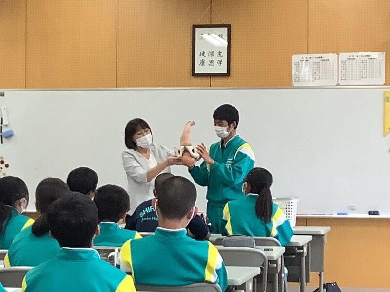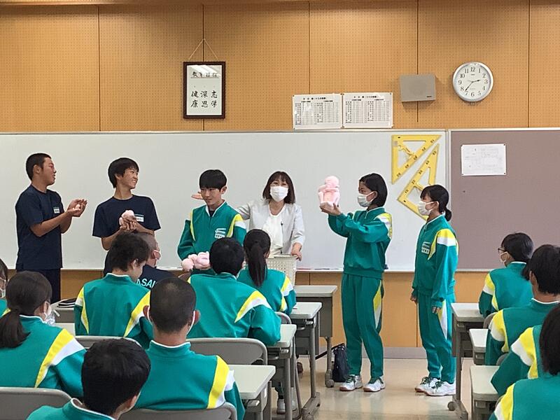 今日は、2学年で、大川レディースクリニックの長谷川様を講師としてお招きし、性教育講話を行いました。「命の大切さ」という題で、お腹の中の赤ちゃんの成長の様子を実物大のぬいぐるみを見たり、女性の骨盤の仕組みなどの説明を聞いたりして学習をしました。実際のお腹の中の赤ちゃんの大きさを見て、驚く生徒もいました。