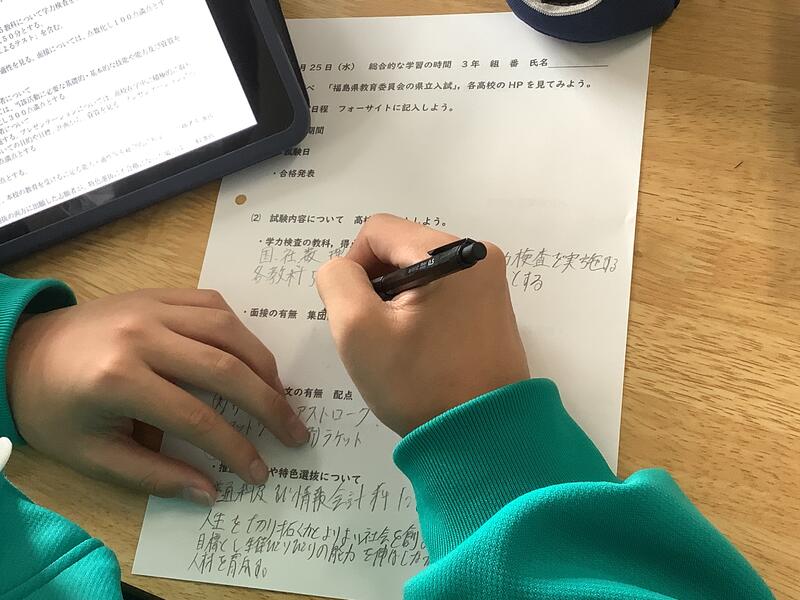 3年生は、高校のHPを見て、入試日程や求める生徒像などを調べていました。試験日を知らない生徒も多く、やはり自分で調べることは重要だと感じました。高校受験は、自分で出願準備をするという実感をもたせるように声かけしていきたいと思います。